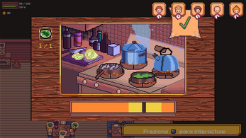 Fork & Sword es un juego de aventura y gestión de taberna con vista top-down en pixel art, donde combinas el combate y la cocina para progresar.